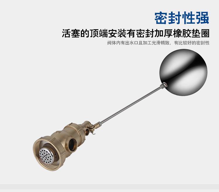 當(dāng)水塔內(nèi)水面下降時(shí),浮球下落,利用水管內(nèi)水的壓力,將閥體里的密封硅膠柱塞打開,閥體開啟供水,當(dāng)水塔水位上升時(shí),浮球上浮,連桿帶動(dòng)柱塞,硅膠體密封進(jìn)水孔,閥體停止供水.
