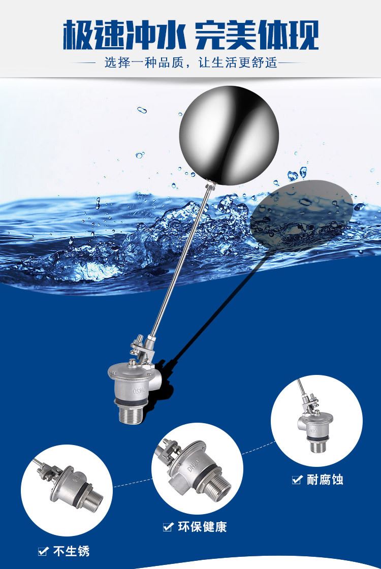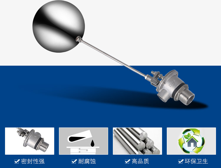 當水塔內(nèi)水面下降時,浮球下落,利用水管內(nèi)水的壓力,將閥體里的密封硅膠柱塞打開,閥體開啟供水,當水塔水位上升時,浮球上浮,連桿帶動柱塞,硅膠體密封進水孔,閥體停止供水.
