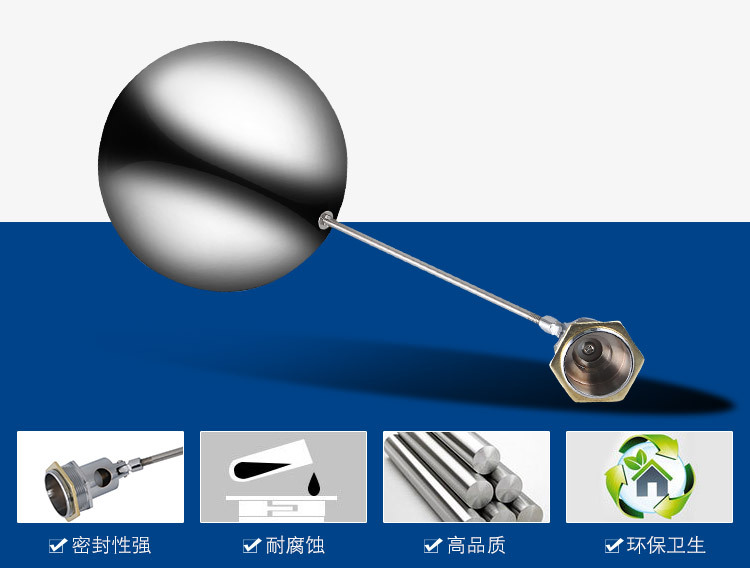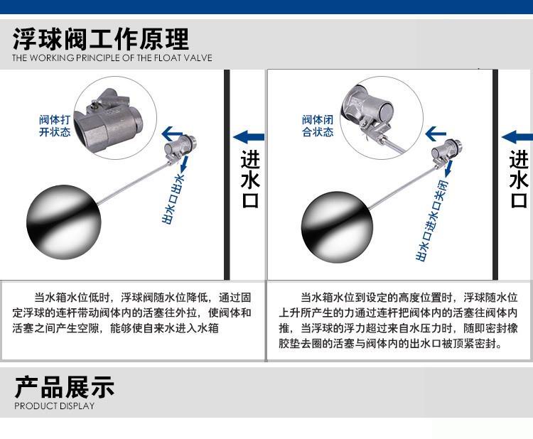當(dāng)水塔內(nèi)水面下降時,浮球下落,利用水管內(nèi)水的壓力,將閥體里的密封硅膠柱塞打開,閥體開啟供水,當(dāng)水塔水位上升時,浮球上浮,連桿帶動柱塞,硅膠體密封進水孔,閥體停止供水.